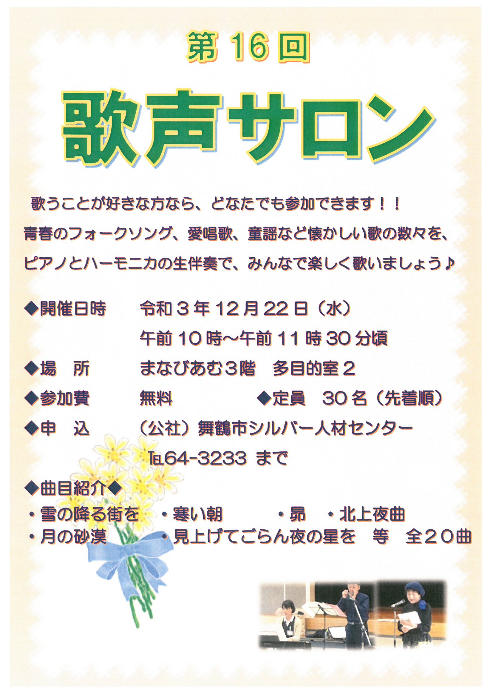 2021/11/15 : 第16回 歌声サロンを開催します♪ 12月22日に 第16回歌声サロンを開催します♪ ハーモニカ ピアノ伴奏、司会に合わせ、童謡 愛唱歌 フォークソング等を歌います。歌の好きな方でしたらどなたでもご参加頂けます。ぜひお越し下さい。 |