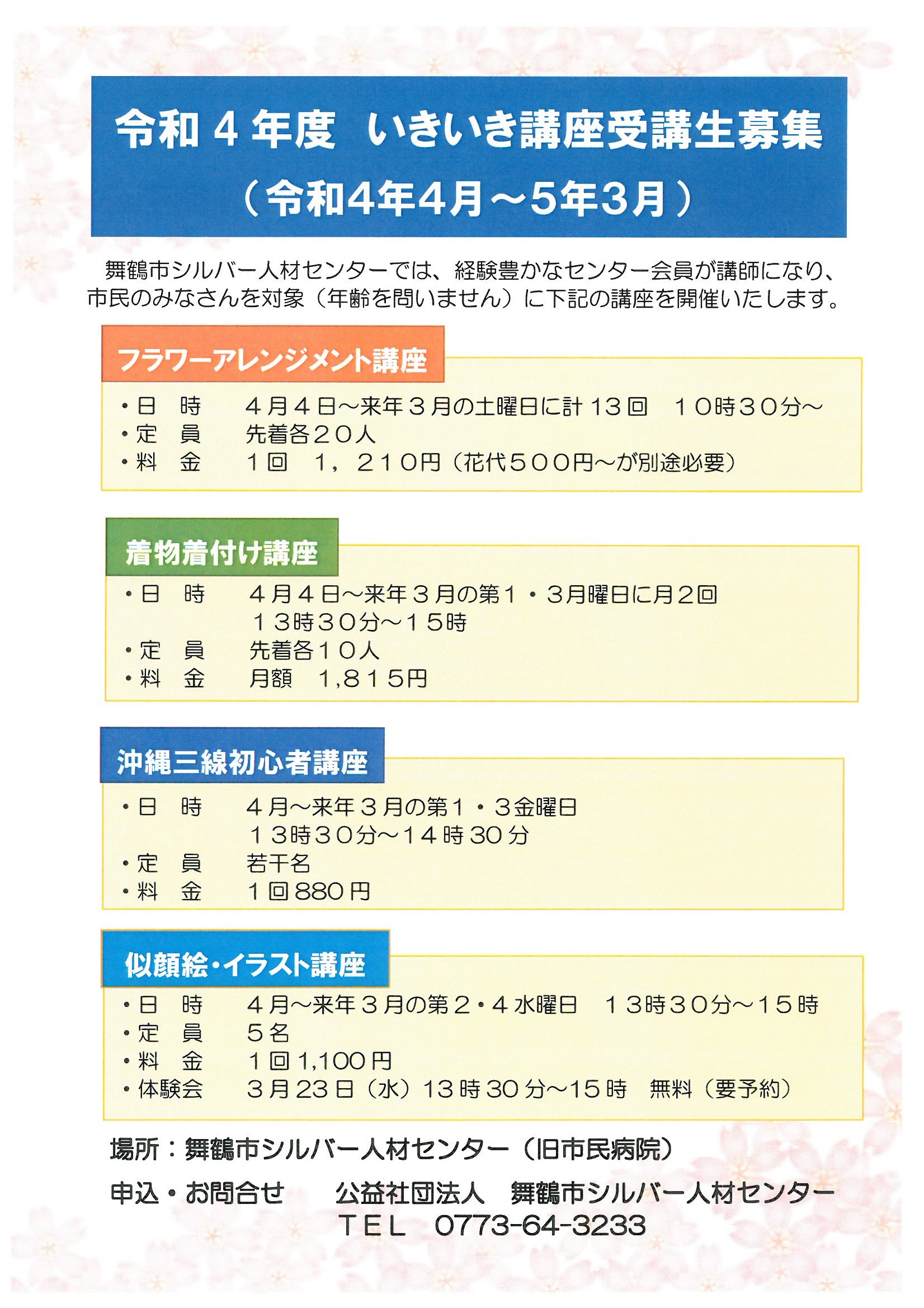 2022/01/28 : 令和4年度 いきいき講座受講生募集 舞鶴市シルバー人材センターでは、経験豊かなセンター会員が講師になり、市民のみなさんを対象(年齢を問いません)に講座を開催いたします。お気軽にお問合せ下さい。 |