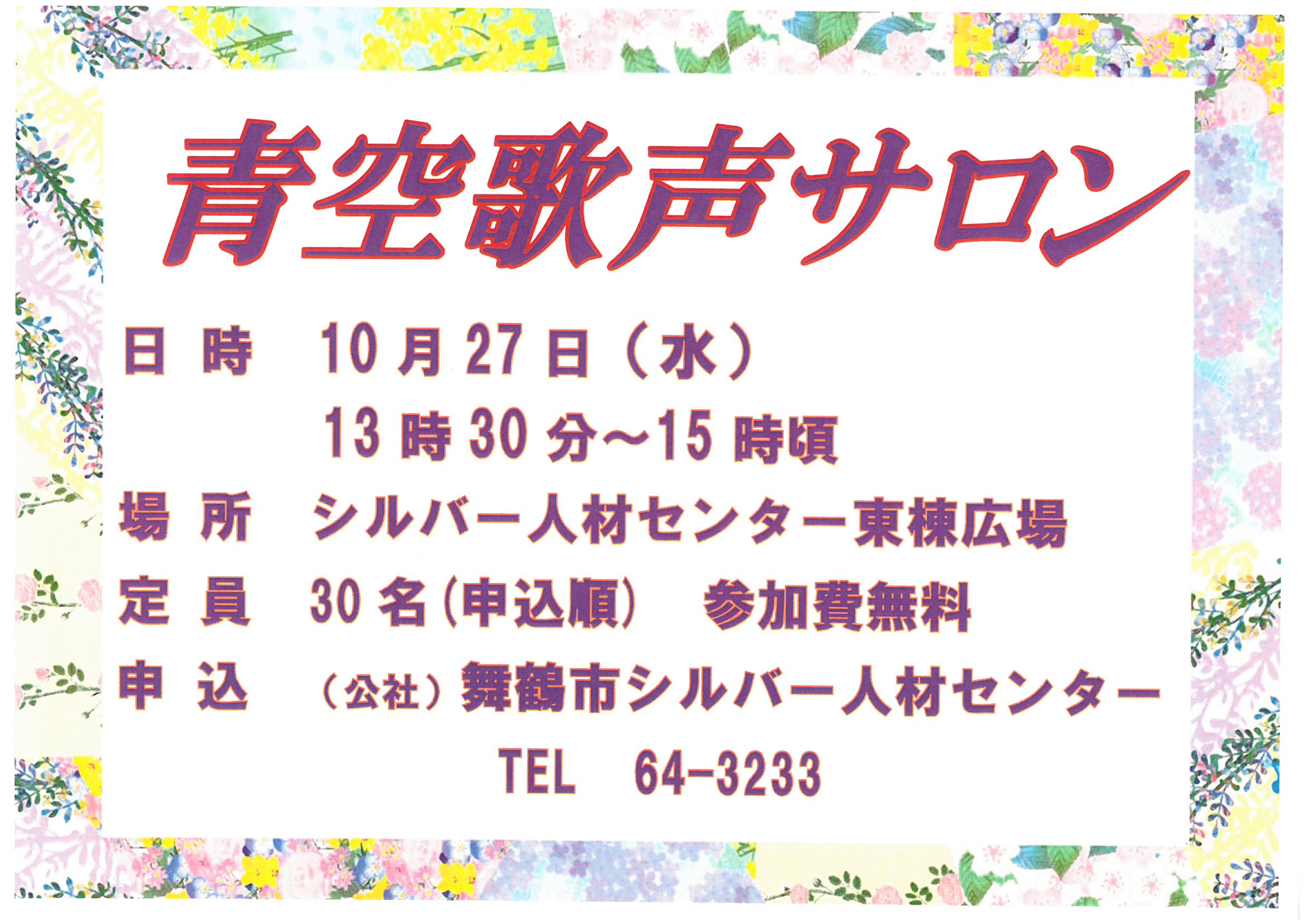 2019/10/03 : 歌声サロンを西舞鶴で初開催します! シルバーで一番の人気イベント、「歌声サロン」を、西舞鶴で初めて開催することになりました!「西舞鶴でも開催を・・」というお声を頂いていたことから実現することができました。 昔なつかしい歌声喫茶のように、生伴奏と司会者のリードに合わせて、童謡や唱歌、愛唱歌、フォークソング等をみんなで歌うイベントです。 歌の好きな方でしたらどなたでも参加できますので、どうぞお気軽にお越し下さい。予約不要、入場自由です。 また、喫茶コーナー・アロマハンドケアコーナーは 12:00〜オープンしていますので、こちらもぜひご利用ください! 皆様のお越しを心からお待ちしています。 |